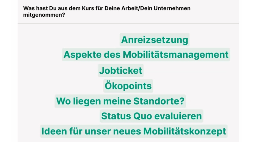 Am 31. Jänner starteten wir mit dem ersten eLearning-Workshop zum Thema Nachhaltiges Mobilitätsmanagement. Die zielgerechte Planung des betrieblichen Mobilitätsmanagements, passende Anreize wie ein Jobticket oder Ökopoints, Wissen über das Verhalten der Mitarbeitenden, das Mitdenken der ersten und letzten Meile, passende Förderschienen, Kooperation mit Partner*innen und mehr wurde im Laufe des Workshops besprochen. Als Expert*innen mit dabei waren Markus Schuster (HERRY Consult & klimaaktiv mobil), Philipp Wieser (Austria Tech & OLÉ) und Katharina Schön (blum).